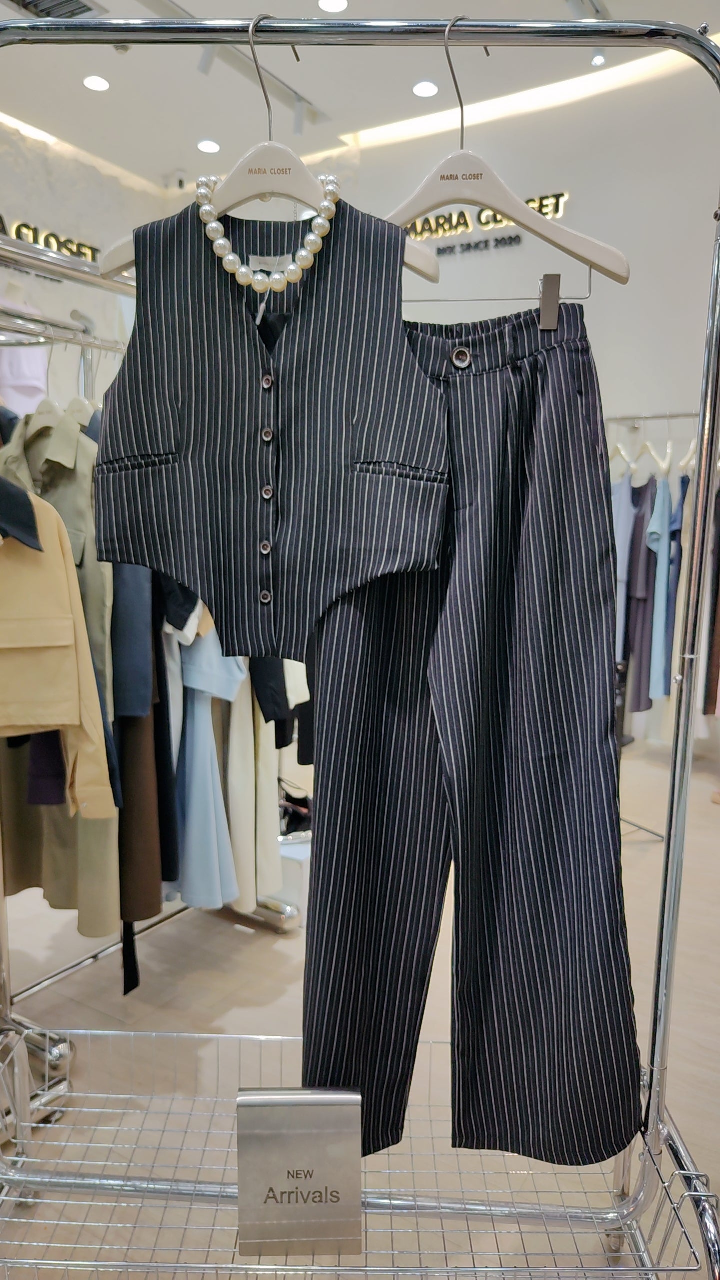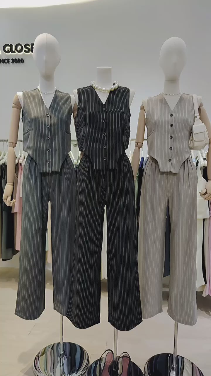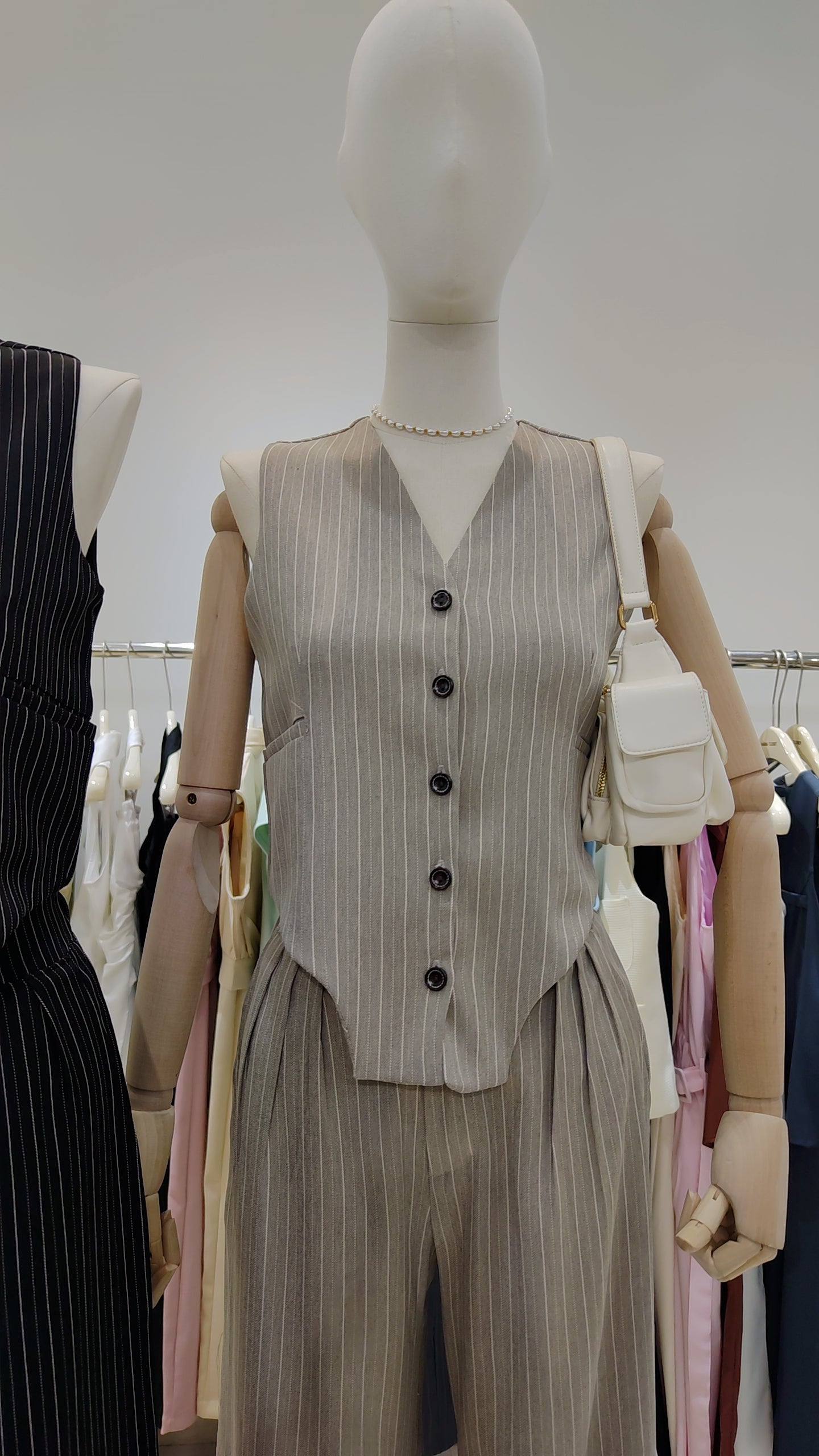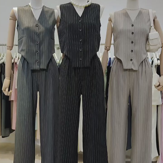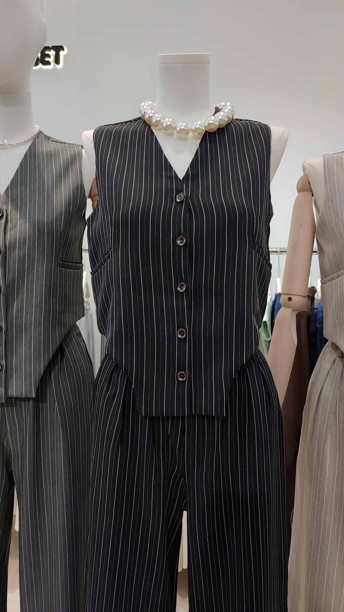 🎨 英倫風✕中性帥氣,這款條紋套裝簡直是上班族與潮人衣櫃必備!V 領背心設計剪裁俐落,搭配寬鬆長褲修身又顯腿長,無論日常或辦公都能輕鬆駕馭。