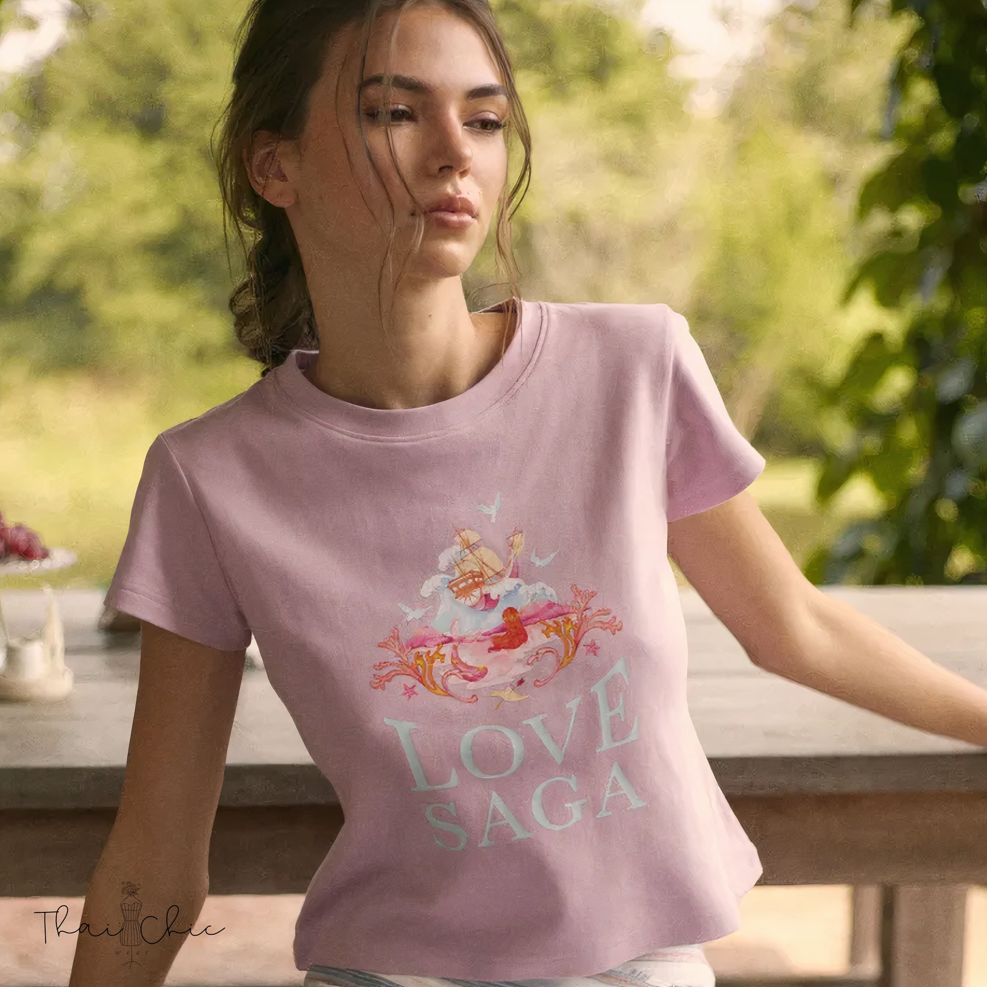 🎨 清新又夢幻的柔和色調,搭配細膩的插畫圖案與「LOVE SAGA」字樣,充滿浪漫的少女氣息,輕鬆穿出甜美活潑的風格。