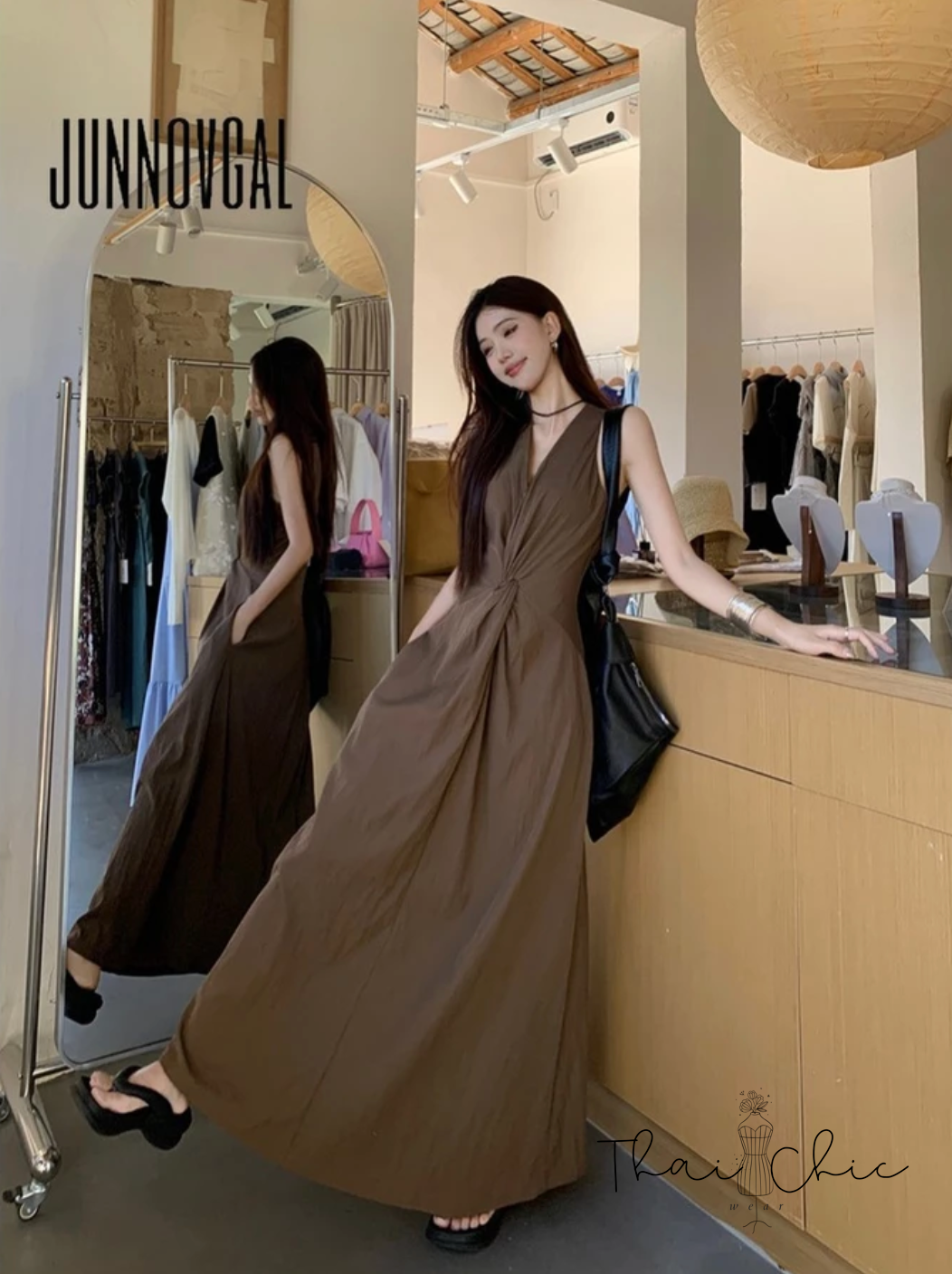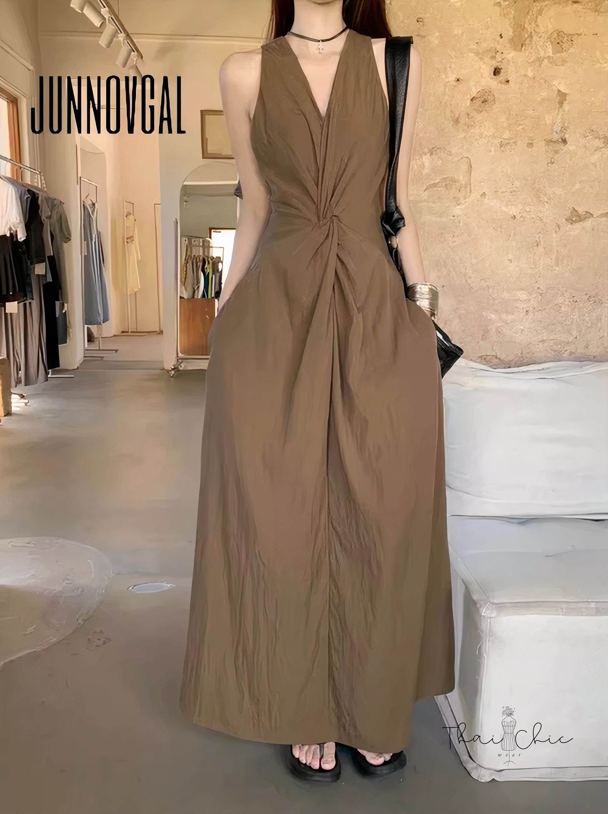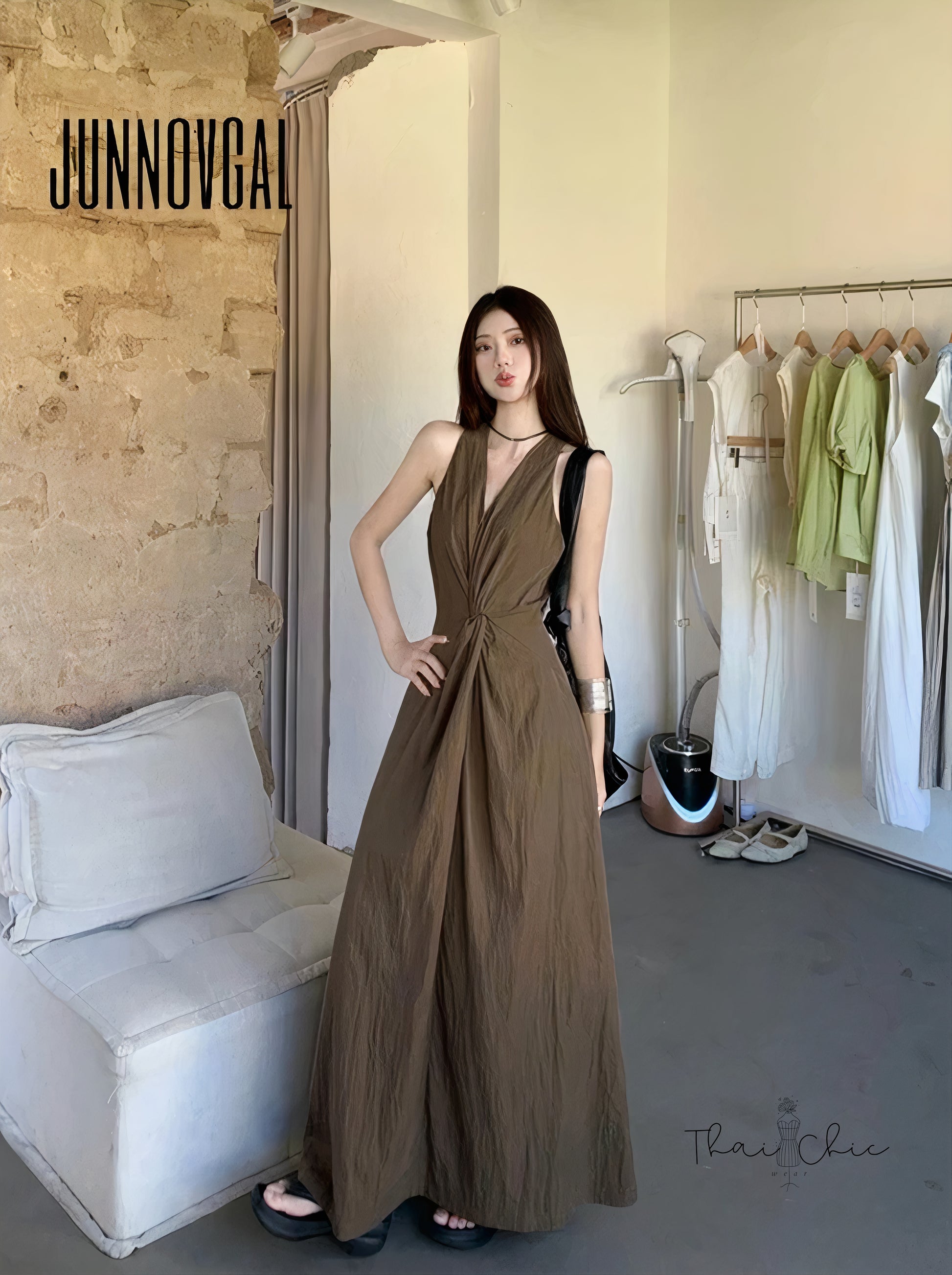 夏日咖啡館感穿搭代表!這款無袖長洋裝採用細緻皺感面料,輕盈不貼身,自帶垂墜線條感。V領+腰間打結設計拉長比例、顯瘦修身。單穿就有氛圍感,配拖鞋或涼鞋就可Chill出街!